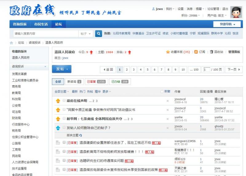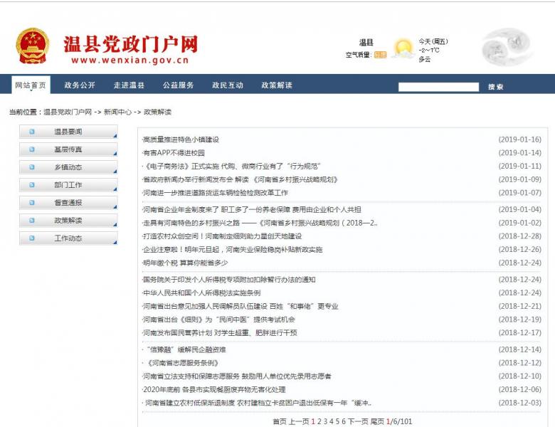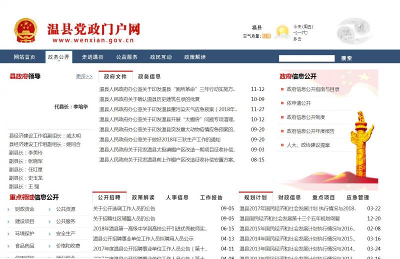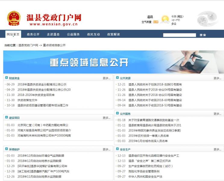 2018年,我县根据全国政府网站发展指引要求,坚持把“温县党政门户网站”作为全县政务信息公开工作的第一平台,组织力量进行全面整改和提高,先后多次对网站结构、栏目进行优化调整,极大地提升了网站信息公开功能。同时,将各级各部门单位网站建设一律纳入“温县党政门户网站”建设框架体系,先后整合网站13家,积极开展政府网站日常监测工作,开展常态化人工监测,对巡查中网站出现的各种问题采用微信工作群通知、电话通知等各种方法督促责任单位进行整改。