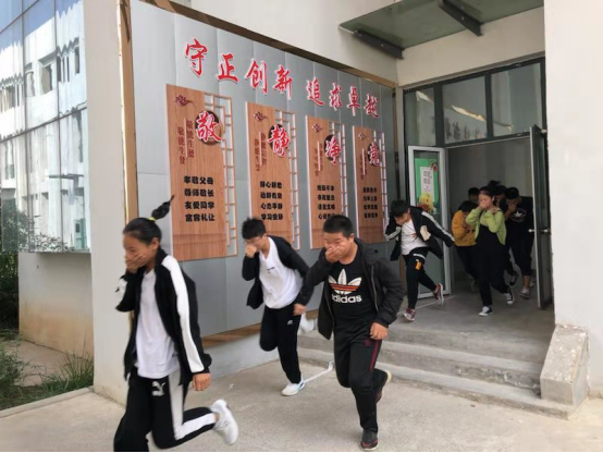 随着演练总指挥“火灾应急疏散演练开始”指令的发出,学校火警铃声大作,喇叭反复播出“发生火灾,立即撤离”的指令,全校师生立即行动,各班学生在老师的引导下,捂住口鼻、猫腰快步从各自教室鱼贯而出,安全有序地转移到避险场所指定位置;搜救人员逐个教室搜寻,没有发现遗漏人员;各班教师点名确认没有遗失、受伤学生。至此演练结束,共用时2分26秒。