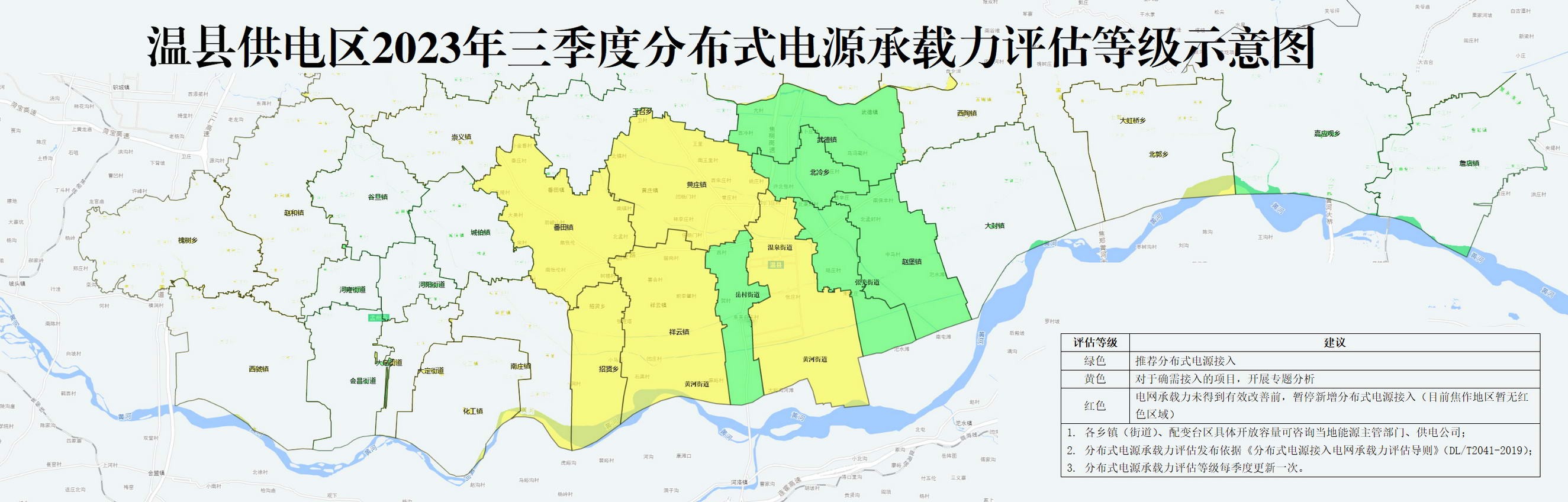 为促进分布式光伏持续健康发展,依据国家能源局发布的《分布式电源接入电网承载力评估导则》(DL/T2041-2019)要求,县发展改革委、国网温县供电公司对全县电网分布式电源承载能力进行了评估,该结果有助于引导温县分布式电源合理布局、有序建设,同时也能为大电网提供一个良好的运行环境。现将温县供电区2023年第三季度分布式电源承载力评估等级结果向社会发布,各乡镇(街道)、各台区承载能力具体情况可咨询县发展改革委或供电部门。
