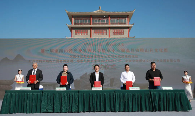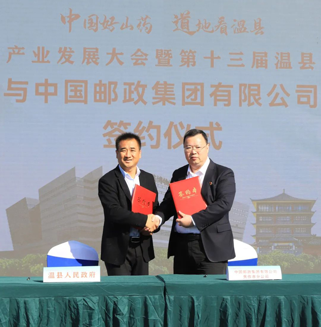 签约仪式上,温县人民政府与中国邮政集团焦作市分公司签订《温县铁棍山药统购统销合作协议》。河南怀商农业发展有限公司与北京健康促进会乡村振兴办、广州市钱大妈农产品有限公司、南京凯美多生物科技有限公司姜作生、安徽中微媒体文化产业发展有限公司签订《温县铁棍山药购销协议》。